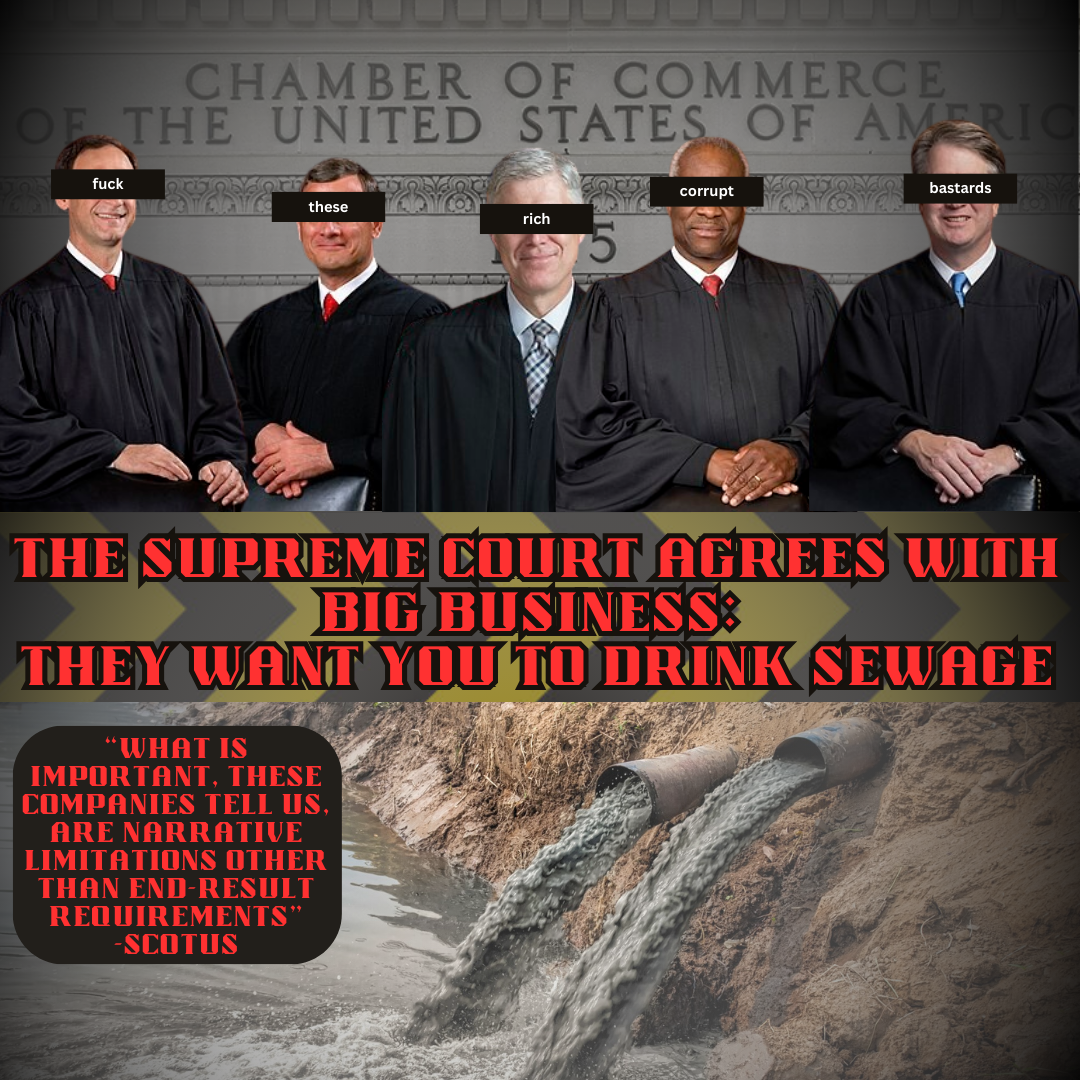 We will now be exposed to sewage, toxic chemicals, mining waste, and further environmental destruction. We see over and over again that the Supreme Court is another tool for the capitalist class to secure their interests over those of the people. We need not only to abolish the Supreme Court, which is an appendage of the capitalist class, but to dismantle the entire capitalist system and build a socialist one that will give the power to the working class to protect our environment and our health!