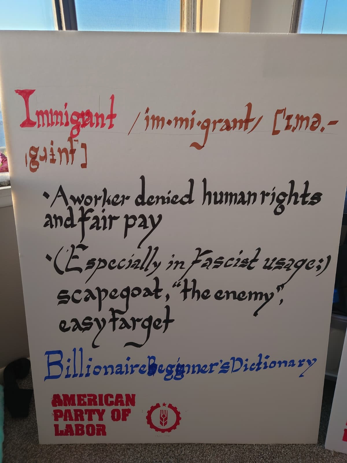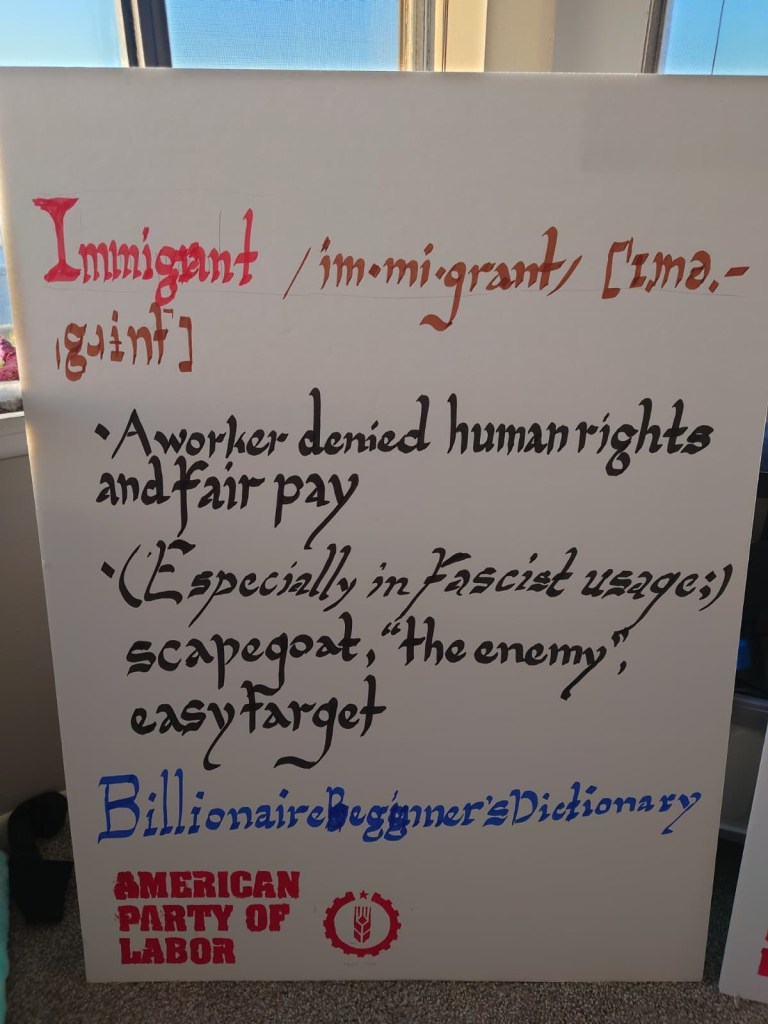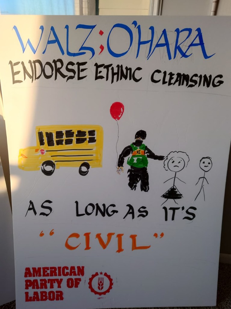 For the two events of Jan. 23, the Thälmann Division crafted four signs, highlighting different aspects of the crisis. One sign, reading “We only see one invader here,” was purely agitational, depicting the murder of Renee Good, inviting the viewer to label ICE the invader. Another brought a more political dimension, but remained agitational: “Walz and Ohara both endorse ethnic cleansing – as long as it’s civil,” with an image of school children being kidnapped by ICE agents sporting a red balloon.