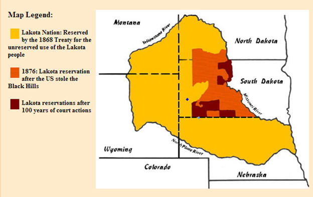 In 1868, the Lakota were promised a substantial tract of land stretching from present day Montana and North Dakota to Nebraska, and encompassing the entire western half of South Dakota, which contained the sacred land known as He Sapa or the Black Hills.