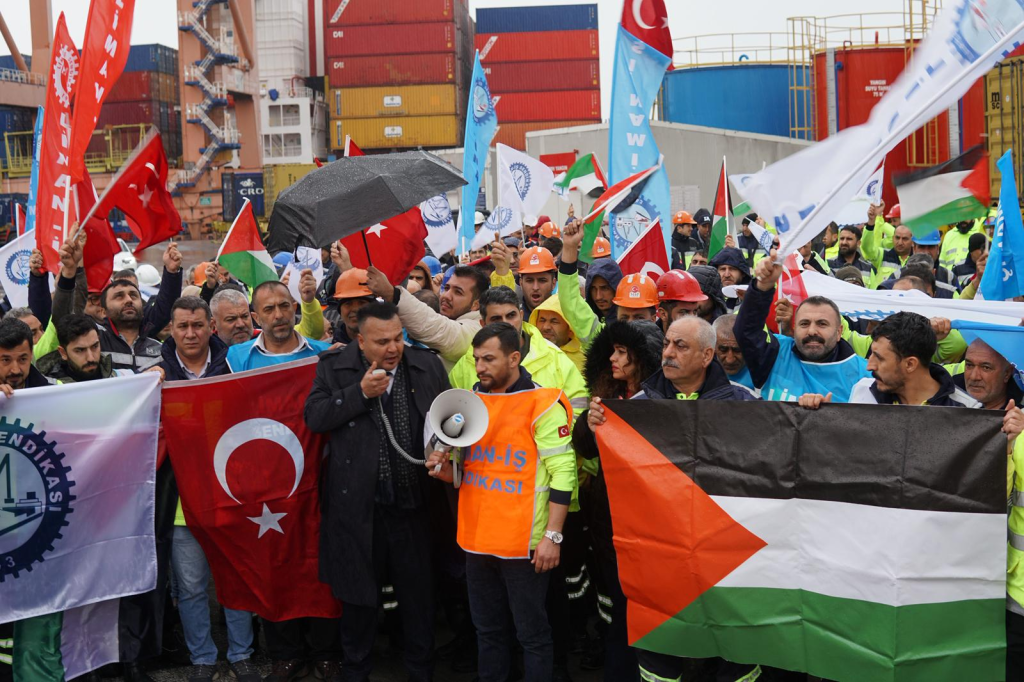 The Turkish dockworkers union, Liman-İş Sendikası, gathered hundreds of workers for a demonstration against the ongoing genocide of Palestinians and issued a statement in support of the Italian unions: